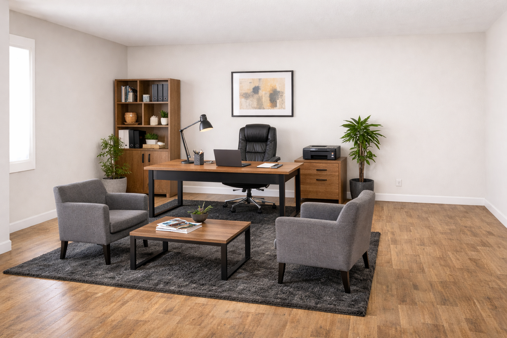 قبل وبعد تجهيز مكتبك بأثاثنا العصري، ستلاحظ كيف تتحول المساحة من عادية إلى بيئة عمل أنيقة